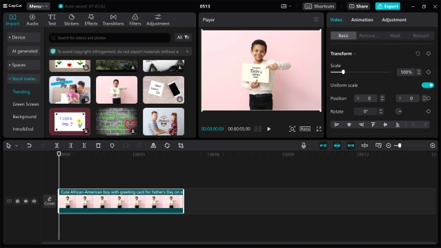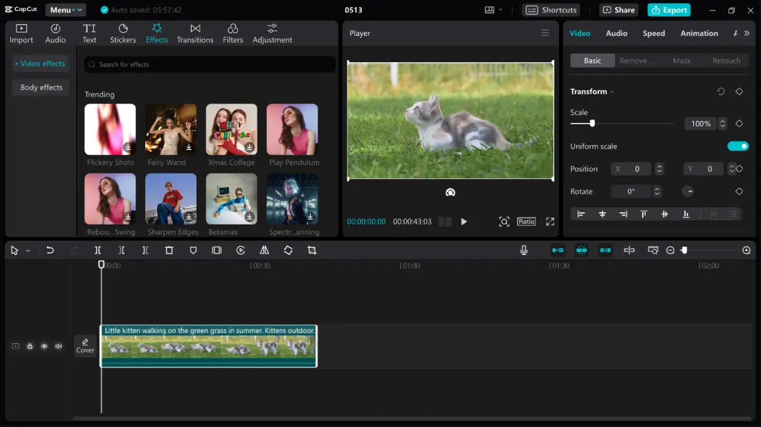 With CapCut, you can change the aspect ratio, adjust the colour values, insert stylish text and stickers, flip audio, add smooth transitions, and infuse trendy filters and effects. The special keyframe animation option lets you set the right angles in the canvas.